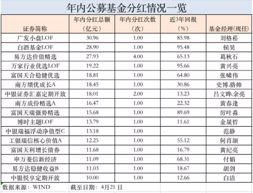具体看来,截至4月21日,年内分红总额最多的为刘格菘管理的广发小盘成长A,分红总额达30.96亿元。虽然一季度收益不太乐观,但近三年回报达85.98%。侯昊管理的招商中证白酒A日前也公告大手笔分红28.90亿元。除此之外,葛秋石管理的易方达价值精选、 黄兴亮的万家行业优选、张啸伟的富国天合稳健优选、 史博、骆帅管理的南方绩优A等多只基金年内也都进行了近20亿的分红。