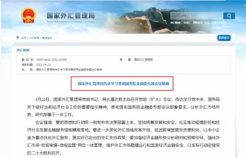 4月22日,国家外汇管理局党组书记、局长潘功胜主持召开党组(扩大)会议,传达学习党中央、国务院关于做好当前经济社会工作的重要指示精神,贯彻落实国务院金融委专题会议部署要求,分析外汇市场形势,研究部署下一步工作。