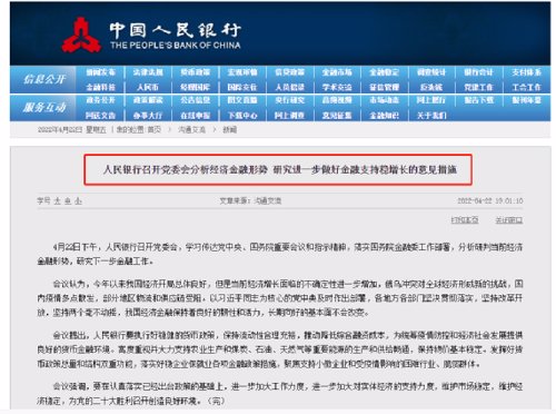 4月22日下午,人民银行召开党委会,学习传达党中央、国务院重要会议和指示精神,落实国务院金融委工作部署,分析研判当前经济金融形势,研究下一步金融工作。