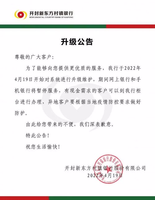 近日,有网友表示,开封新东方村镇银行无法取款。21世纪经济报道记者获悉,中国人民银行开封市中心支行、开封银保监分局于4月22日发布公告进行了回应。