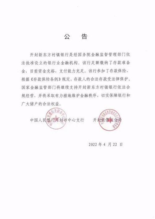 公告表示:开封新东方村镇银行是经国务院金融监督管理部门依法批准设立的银行业金融机构。该行足额缴纳了存款准备金,目前资金充裕,支付能力充足。该行参加了存款保险,根据《存款保险条例》规定,存款人的合法存款受法律保护。国家金融监管部门将继续支持开封新东方村镇银行依法合规经营,并将采取有力措施维护金融秩序,切实保障银行和广大储户的合法权益。