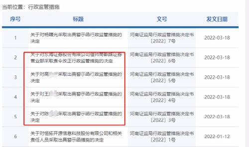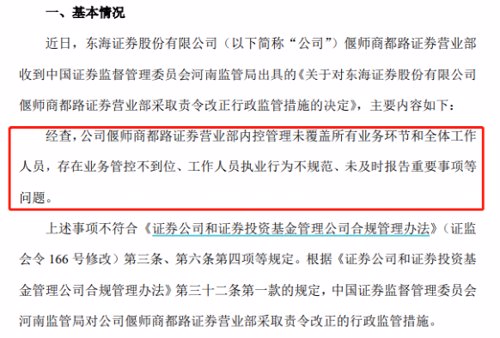 具体来看,河南证监局指出,东海证券偃师商都路证券营业部内控管理未覆盖所有业务环节和全体工作人员,存在业务管控不到位、工作人员执业行为不规范、未及时报告重要事项等问题。根据法律规定,河南证监局对该营业部采取责令改正的行政监管措施。