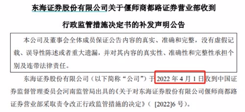 日前,东海证券发布公告称,其在4月1日收到河南证监局对其偃师商都营业部做出责令改正的行政监管措施。但由于“因疫情管控居家办公导致公司内部信息传导不及时”,该份公告直至4月21日才进行披露。