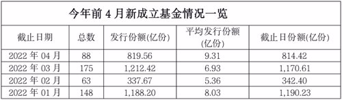 Wind数据显示,截至4月末,4月共有88只新基金成立(各份额合并统计),合计发行规模819.56亿元。