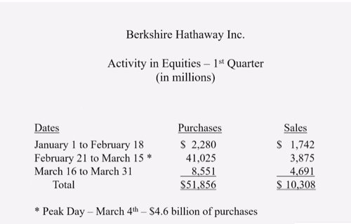 巴菲特表示,公司在4月份的时候没有回购股票;从2月21日开始的三周内,