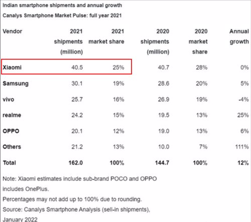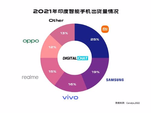 据统计机构Canalys的数据,2021年,印度智能手机市场主要被中国品牌占领,其中,小米占有四分之一的市场。