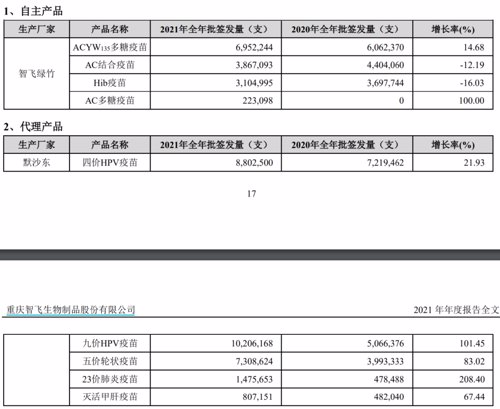 年报也显示,智飞生物作为默沙东HPV疫苗在中国大陆地区的独家代理,在2021年的九价和四价HPV疫苗全年批签发量分别为1020.62万支和880.25万支,同比增长幅度达到101.45%和21.93%。