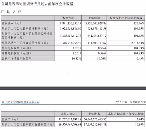 2022年一季报也显示,智飞生物一季度实现营业收入88.41 亿元,同比增长125.16%;实现归母净利润19.23 亿元,同比增长104.95%。针对营业收入大增,公司表示,主要是本期销售持续增长所致。