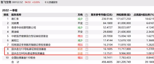 智飞生物披露的2022年一季报显示,百亿私募迎水投资旗下的两只产品在一季度杀入公司前十大流通股东名单,迎水合力13号私募基金、迎水合力9号私募基金,合计买进2168.3万股,期末持股市值高达29.92亿元。明星基金经理葛兰管理的中欧医疗健康混合基金也增持了智飞生物45.87万股,持股数量增至1500.42万股,期末持股市值为20.71亿元。