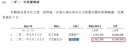 根据招股书,百果园最后一笔股权交易为2021年10月,晨光股权以每股8元的价格从才金涛购买了206.25万股股份,对价1650万元。
