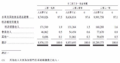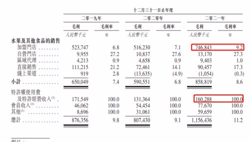百果园的收入主要来自产品销售,其他包括特许权使用费及特许经营收入、会员收入等。以2021年数据看,百果园营收高达102.89亿元,但销售成本超91亿元,毛利率仅11.2%,平均单店净利润仅4万元出头,净利润率仅仅2%,还赶不上定期存款利率。