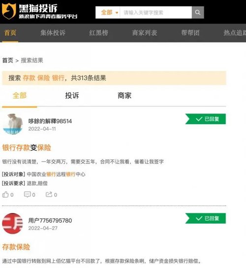 记者查询黑猫投诉平台,以“存款”、“保险”、“银行”为关键词同时检索,发现其中仍旧有一些当事人投诉银行—想存款却被推销购买了保险产品。
