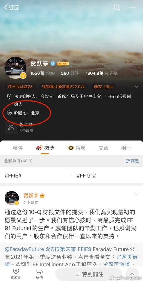 5月7日,贾跃亭发微博称,通过10-Q财报文件的提交,离实现最初的愿景又近了一步。微博IP显示此消息发布于北京,贾跃亭微博主页也显示IP属地为北京。对此,网友评论称:贾总回北京了?也有人认为,账号可能是北京的工作人员在运营。