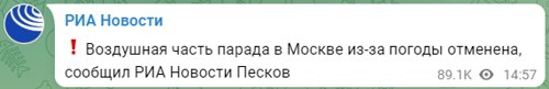 综合俄罗斯塔斯社、俄新社最新报道,俄总统新闻秘书佩斯科夫称,阅兵式空中检阅部分因天气原因取消。
