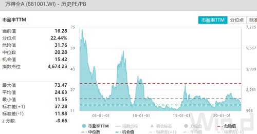 Wind数据显示,截至2022年5月12日,万得全A市盈率为16.28倍,处于近二十年(2002年5月13日至2022年5月12日)以来的22.44%分位,位于低估区间,但高于2013-2014年最低估的阶段。