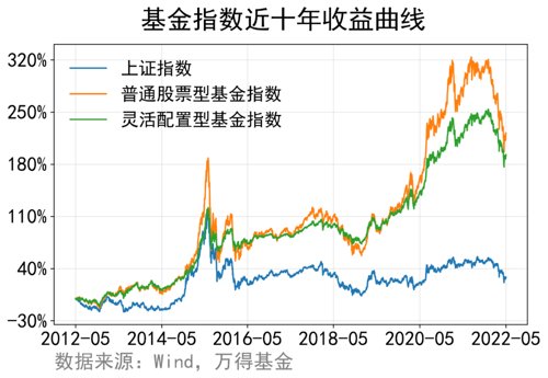 Wind数据显示,近10年(2012年5月13日至2022年5月12日),虽然上证指数仅上涨28.3%,长时间在3000点上下波动;但普通股票型基金指数、灵活配置型基金指数却分别上扬了221%、193%。
