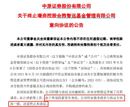 自该协议签署以来,中原证券积极与协议方沟通磋商,并对合煦智远开展了尽职调查、审计评估等工作。由于外部因素发生变化,经审慎考虑并与协议方协商一致,中原证券决定终止本协议。