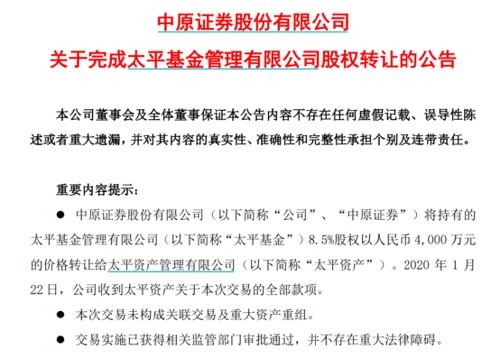 2016年7月,证监会核准中原证券将其持有的34%股权、安石投资将其持有的32%股权转让给太平资产,中原英石基金更名为太平基金。一年后,太平资产增资太平基金,中原证券所持股权进一步稀释至8.5%。至2019年底,中原证券最终将其持有的太平基金股权全部转让给太平资产,正式退出太平基金股东序列。