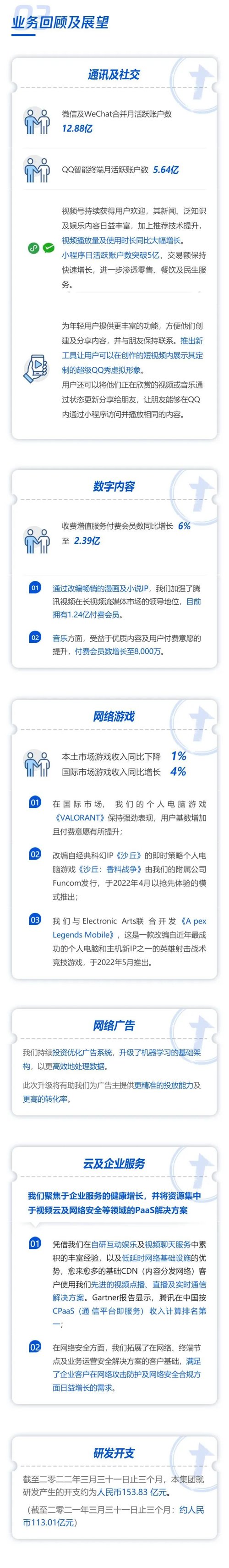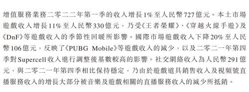 4、社交网络收入增长1%至人民币291亿元,反映视频号直播服务的收入增加,但大部分被音乐直播及游戏直播收入下降所抵销。