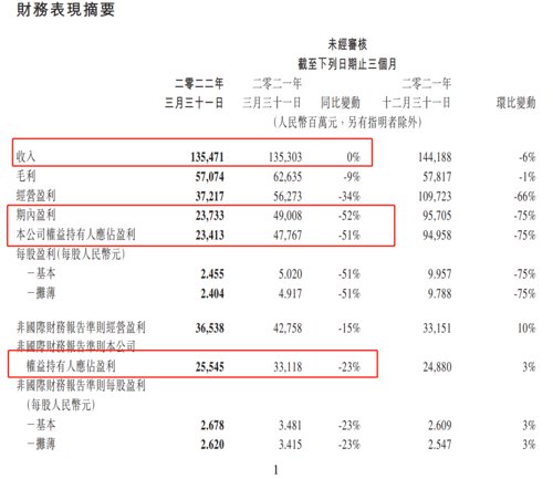 财报显示,一季度腾讯营收1355亿元,市场预期1410.58亿元,上年同期1353.03亿元,同比基本持平。净利润234亿元,同比下降51%。非国际财务报告准则(Non-IFRS)下,净利润255亿元,同比下降23%。