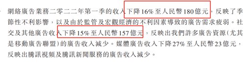 5、网络广告业务二零二二年第一季的收入同比下降18%至人民币180亿元