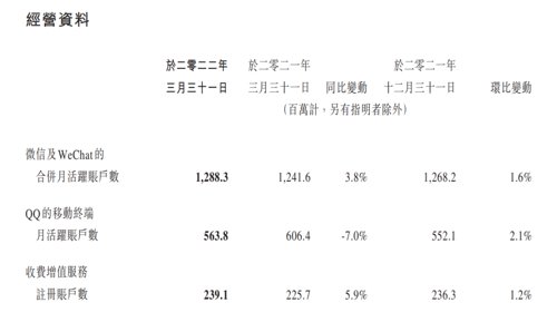 截至2022年3月31日,QQ移动端月活跃账户数5.638亿,同比下滑7%。