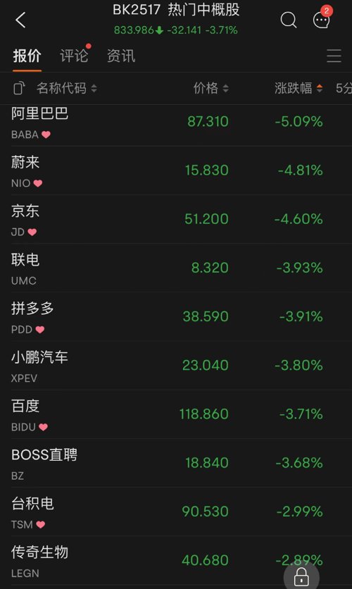 此外,知乎跌5.31%,美团跌3.51%,百度跌3.71%,腾讯跌7.08%;网易有道涨13.85%,虎牙涨3.5%,爱奇艺涨2.17%。贝壳涨2.43%,叮咚买菜跌5.92%。