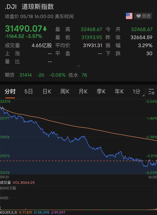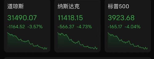 截至收盘,道指跌3.57%或1164.52点,报31490.07点;纳指跌幅为4.73%,报11418.15点;标普500指数跌幅为4.04%,报3923.68点。
