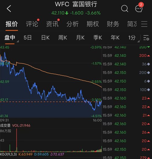 除科技股外,周三银行股也集体下跌,花旗、美国银行、富国银行跌超3%,高盛、摩根士丹利跌超2%,摩根大通跌1.7%。