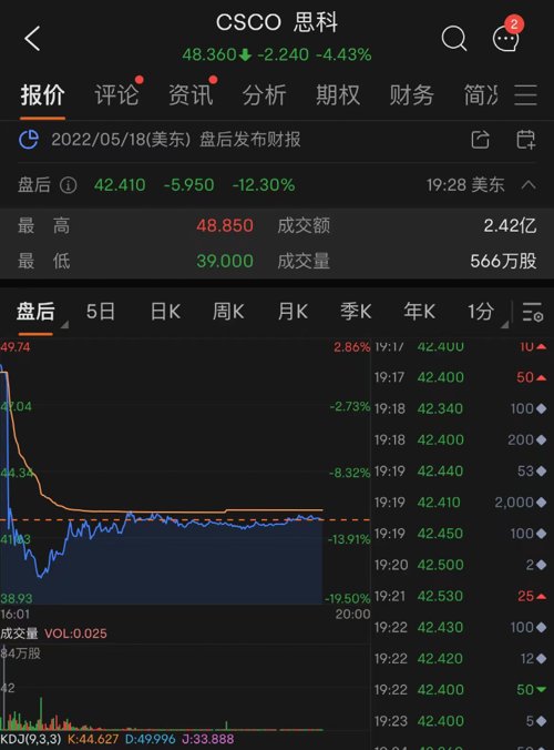 财报发布后,思科股价暴跌,一度跌超17%,截至发稿,跌幅收窄至12%。