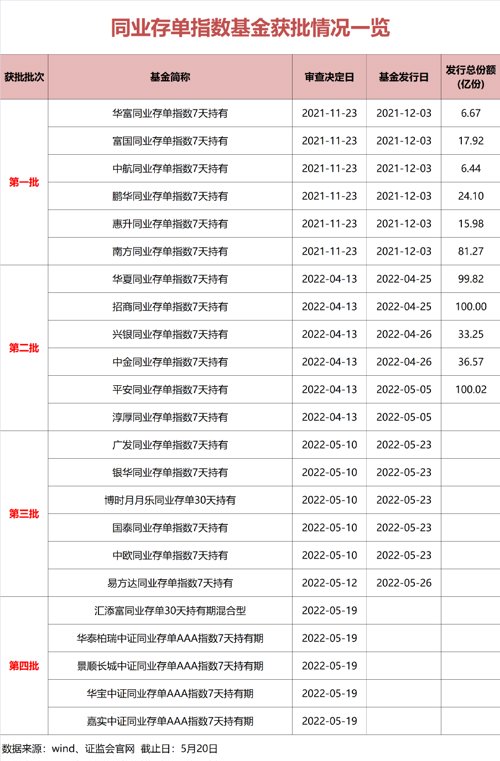 数据显示,截至今年5月20日,同业存单指数基金已经陆续有4批23只产品获批,目前已经有前两批产品发行和成立,第三批产品定档于5月23日同一天发行,第四批产品接续拿到批文,也获准发行。