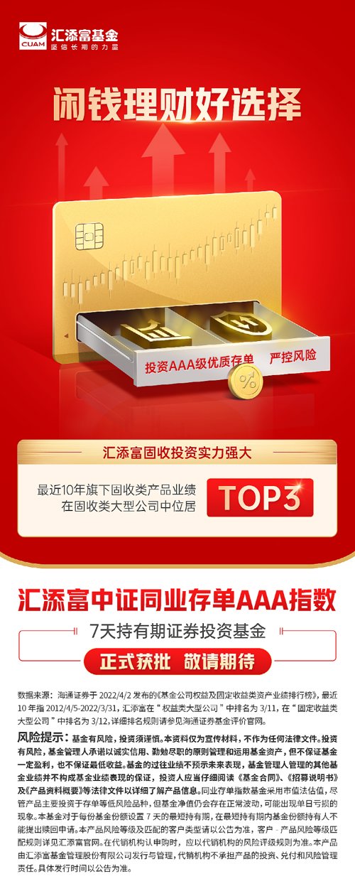 据了解,汇添富在固定收益投资领域实力雄厚。根据海通证券2022/4/2发布的《基金公司权益及固定收益类资产业绩排行榜》数据,最近10年汇添富旗下固收类产品业绩在固收类大型公司中位居第3。