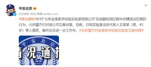 另据第一财经的报道,目前北京市公安局尚未通报北京金准医学检验实验室有限公司在核酸检测过程中涉嫌了哪些违法内容。