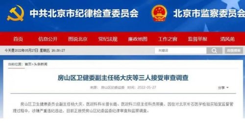 5月27日下午,据北京纪检监察网,房山区卫生健康委员会副主任杨大庆、医政科科长晋长皓、医政科三级主任科员邢曼,因在对北京朴石医学检验实验室监督管理过程中,涉嫌严重违纪违法,目前正接受房山区纪委监委纪律审查和监察调查。