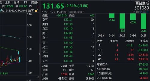 截至收盘,百普赛斯股价131.65元,跌2.81%,市值108亿。