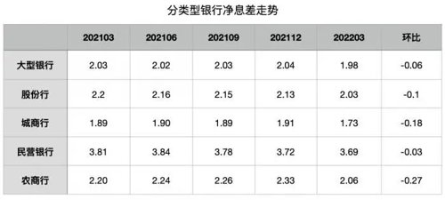 商业银行主要监管指标情况表显示,今年一季度商业银行净息差为1.97%,环比下降0.11个百分点,较2021年同期下降0.2个百分点,处于历史低点。