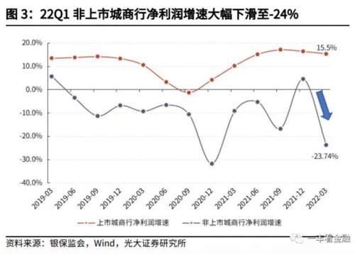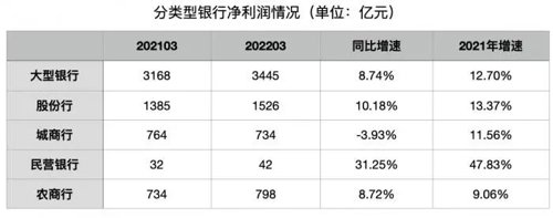 一季度,大型银行、股份行、城商行、民营银行、农商行净利润同比增速分别为8.74%、10.18%、-3.93%、31.25%、8.72%,均较2021年全年增速下降,但城商行降幅最大,且为负增长。