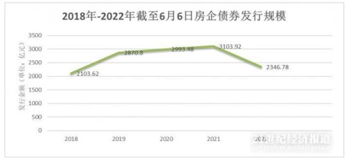 21世纪经济报道记者根据Wind数据统计,截至2022年6月6日,房地产企业累计发行债券257只,发行金额合计2346.78亿元,与2021年同期的发行规模3103.92亿元相比减少24.39%,而2019、2020年同期房地产企业的债券发行总金额分别为2870.8亿元、2993.48亿元。