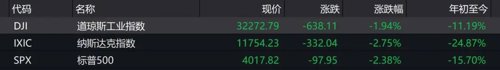 道琼斯工业指数下跌638.11点,收于32272.79点,跌幅1.94%。标准普尔500指数下跌2.38%,收于4,017.82点;纳斯达克综合指数下跌2.75%,收于11,754.23点。
