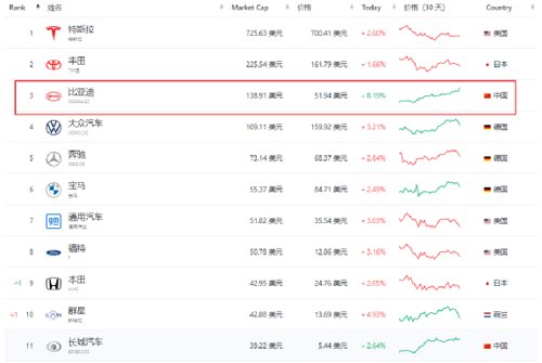 比亚迪不仅是中国市值最高车企,远远超过第二名长城汽车;放眼全球,比亚迪更入榜全球汽车市值前三,今日上涨将德国大众汽车进一步甩在身后: