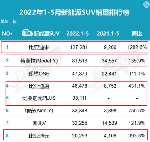 在比亚迪占优势的新能源SUV车型榜单上,宋、唐、元PLUS及元四款车型大杀四方,占销量榜前十中4席,其中最热销的比亚迪宋销量近13万台,激增近13倍!其中3款车型销量增速,均超特斯拉热销款Model Y。