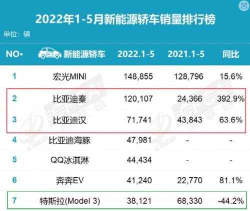 依据乘联会数据,今年前五月的新能源轿车销量榜单中,比亚迪有两款车型占据前二、前三,秦一款车型的销量达12万台,激增近4倍!相比较,特斯拉热卖的Model 3反而同比下滑44%。