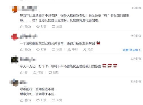 有网友吟诗作对:“艰难前行,当知奋进不易;世事变幻,当知勇于革新”;更有股东放出豪言,合格股东得自己买两台车,还要介绍朋友买10台!