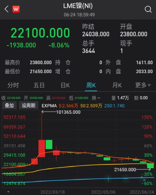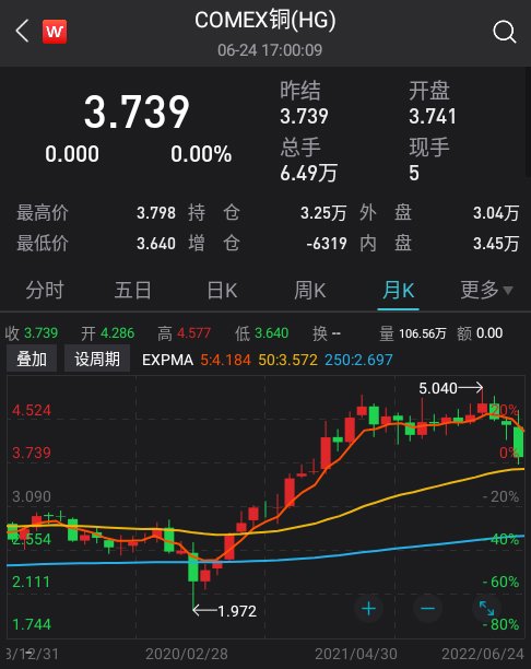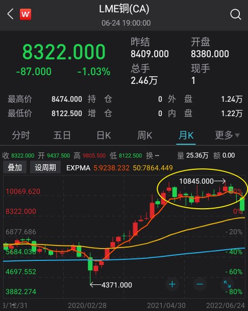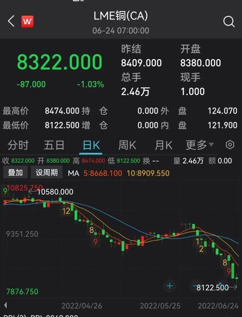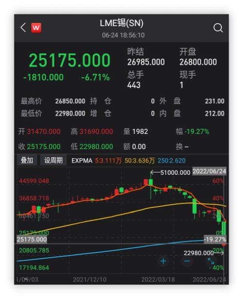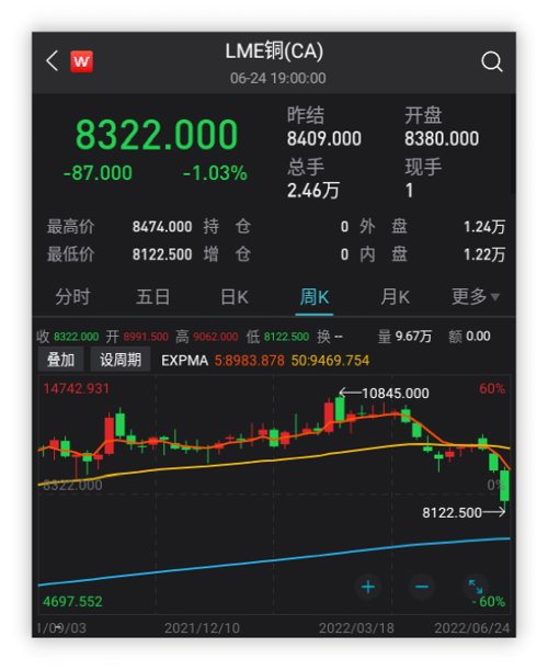 其它金属也全面崩塌:伦铅跌超7%,伦锌跌近5%,均连跌三周;伦铝跌约1.7%,连跌五周。市场担心,铜价已经从高点下跌逾23% ,跌至16个月低点,反映全球经济“衰退”风险超过“通胀”风险,全球衰退、大宗见顶的呼声再起。