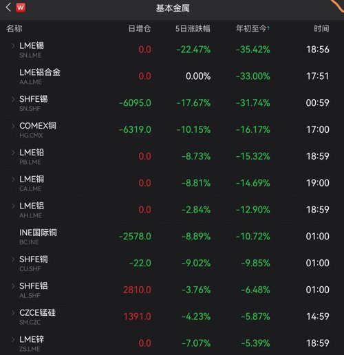 连跌两周的伦锡继续领跌,近一周跌20%,跌幅几乎为上周的两倍,价格已较今年3月的高点腰斩。