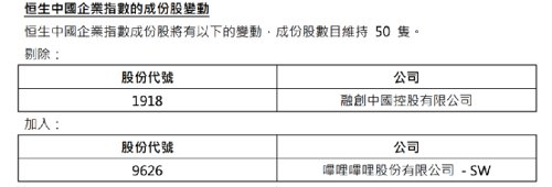 根据公告,恒生中国企业指数(“国企指数”)剔除融创中国,纳入哔哩哔哩,成分股数目维持在50只。