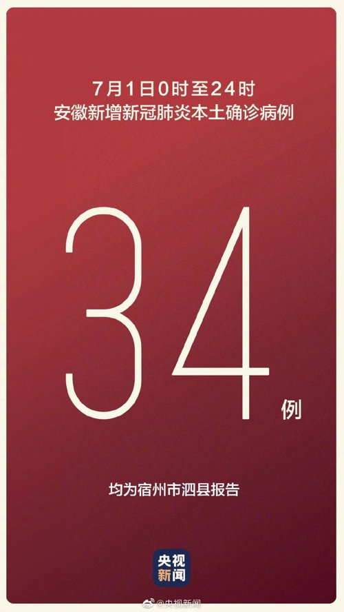 根据健康安徽通报,2022年7月1日0-24时,安徽省报告新增确诊病例34例(均在宿州市泗县),无新增疑似病例,新增无症状感染者101例(宿州市泗县100例,蚌埠市固镇县1例)。