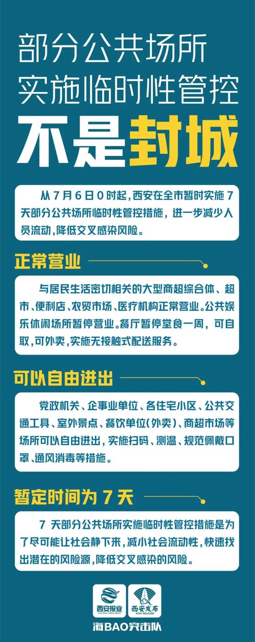 从7月6日0时起,西安在全市暂时实施7天部分公共场所临时性管控措施,进一步减少人员流动,降低交叉感染风险。