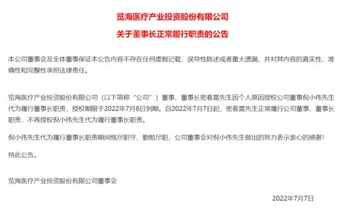 7月6日盘后,退市海医公告,公司董事、董事长密春雷因个人原因授权公司董事倪小伟代为履行董事长职责,授权期限于2022年7月6日到期。自2022年7月7日起,密春雷正常履行公司董事、董事长职责,不再授权倪小伟代为履行董事长职责。