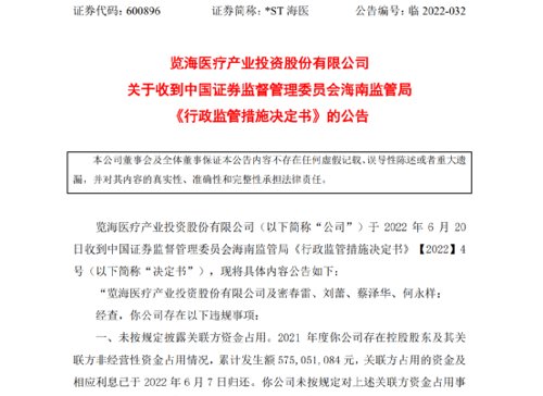 与退市公告一同披露的还有监管机构的处罚。6月21日,*ST海医因未按规定披露关联方资金占用以及债权未收回事项等,海南证监局决定对公司及董事长密春雷等高管采取出具警示函的行政监管措施,并记入资本市场诚信信息数据库。